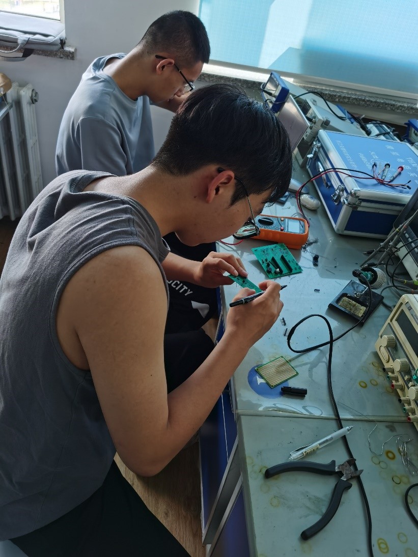 在公司领导的大力支持下,竞赛开展了有效的培训计划,从大一开始就进行了有计划的培训活动,这些保证了竞赛持续稳定产出。赛前宋其江组织竞赛指导教师王立峰、李丹丹等利用周末时间,在508实验室进行了6次赛前培训活动,指导元器件和仪器仪表使用、电路设计和仿真、单片机编程能力,通过蜂鸣器电路设计、温度报警、可控调光、可控云台等项目式训练,有力地培养了员工的实践能力,这些培训为本次比赛打下了坚实基础。培训和竞赛期间如图所示。希望通过有效竞赛机制运行,还有指导老师的持续投入,明年全国电子设计大赛取得更优秀的成绩,为培养一流人才贡献力量。