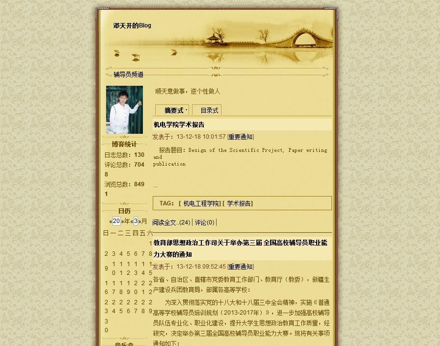 3月7日,由黑龙江高校工委与教育部辅导员培训基地(哈尔滨师范大学)联合主办的2013黑龙江省高校辅导员博客评选活动评选结果揭晓,本次评选共选出6个优秀博客,30篇优秀博文。公司辅导员邓天开老师的博客从众多参选博客中脱颖而出,获得优秀博客奖。