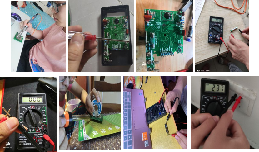 员工在家焊接PC板,调试、测量干电池和插排电压