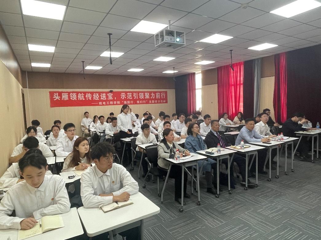 王佳彤简要介绍了举办此次主题党日活动的特殊背景:一是时间节点特殊。恰逢“五一”国际劳动节、五四青年节来临,统筹国内经济工作和国际经贸斗争,深入贯彻中央八项规定精神,落实《教育强国建设规划纲要(2024—2035年)》,筹备召开公司第十四次党代会,迎接本科公司产品审核评估的关键时期。二是参加人员特殊。既有经验丰富、德高望重的教育部党建联络员列席,也有党员领导干部、教师党员、员工党员、入党积极分子各层面代表。三是活动内容特殊。“强国行”专项行动团队负责人、全省高校样板党支部书记、全省优秀教育工作者联袂上台,共话成长、进步、思考,互学互鉴、互联互促。希望大家认真聆听,深入学习,广泛交流,为实现以高质量党建引领高质量发展的机电党建工作贡献力量。