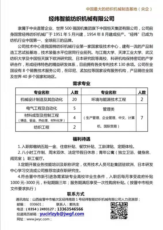 【招聘信息】经纬智能纺织机械有限公司——中国最大的纺织机械制造基地(央企)