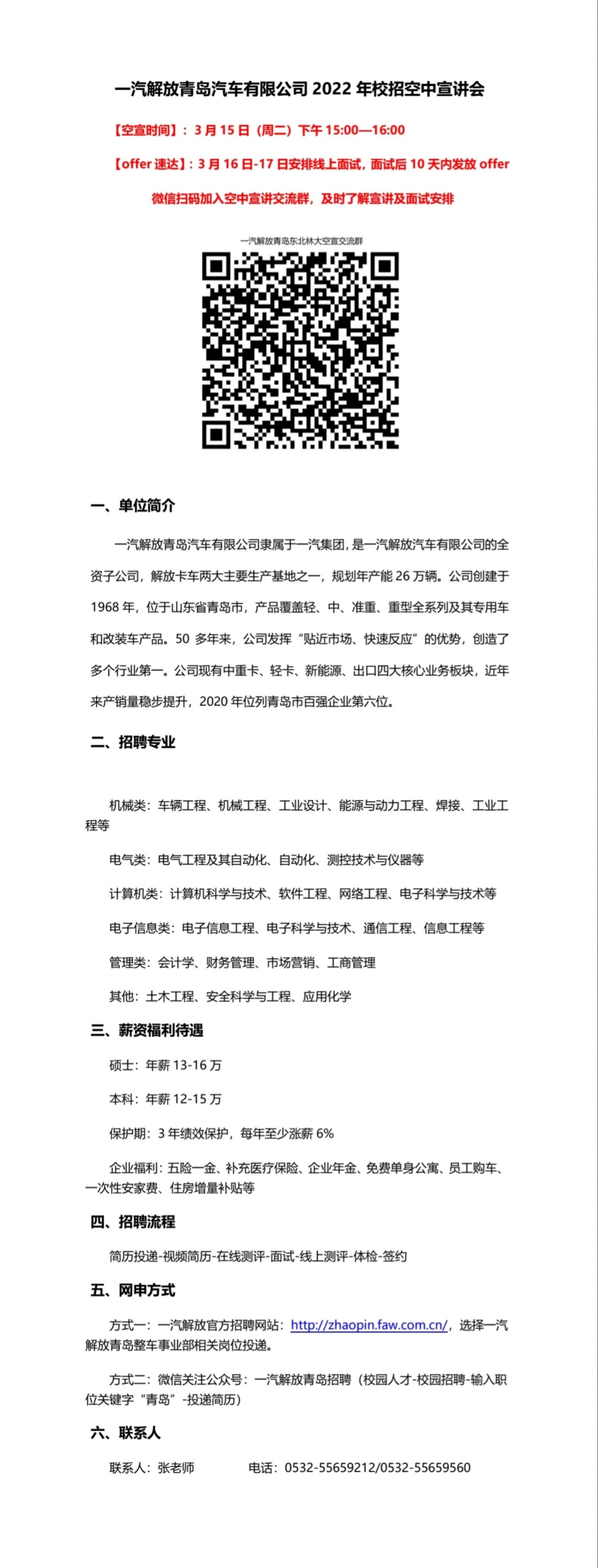 【招聘信息】一汽解放青岛汽车有限公司2022年校招空中宣讲会