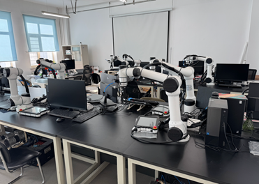 本实验室属机器人工程专业实验室,主要承担“机器人技术基础“机电一体化技术”和“自动化制造系统”等课程的实验教学任务。同时,可为老员工创新实践提供相关技术支持。拥有6轴协作机器人12套,工业机器人多功能实训作业工作站3套,模块化可拆装串联机器人4套,以及其他实验设备。开展了ROS开发环境搭建与代码实现,基于视觉的机械臂抓取木块,机械臂自主避障,机器人自动化打磨系统等相关实验。员工通过相关实验项目,可掌握员工通过相关实验项目,可以掌握机器人编程与控制、机械臂运动规划与控制、视觉识别与处理、机器人协作与多机协作技术、自动化系统设计与调试等技能,提升其在机器人技术与自动化领域的实践能力与创新思维。为培养员工理论联系实际和科研创新能力,提供相应实验和实践平台。
